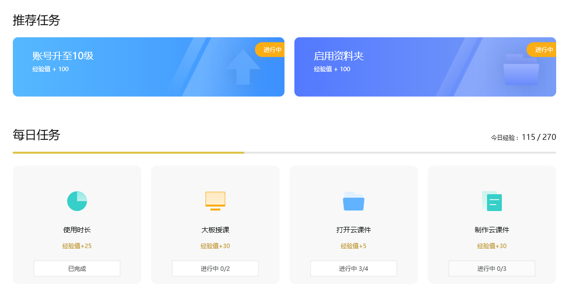 信息化教學(xué)已成為老師們的常態(tài),長(zhǎng)虹啟課3開啟了全新的“會(huì)員成長(zhǎng)計(jì)劃”,按照每日任務(wù)打卡,可以獲得相應(yīng)的經(jīng)驗(yàn)值,達(dá)到一定的經(jīng)驗(yàn)值可以獲得云空間、專屬的課件模板、課堂活動(dòng)模板等多種會(huì)員特權(quán)。