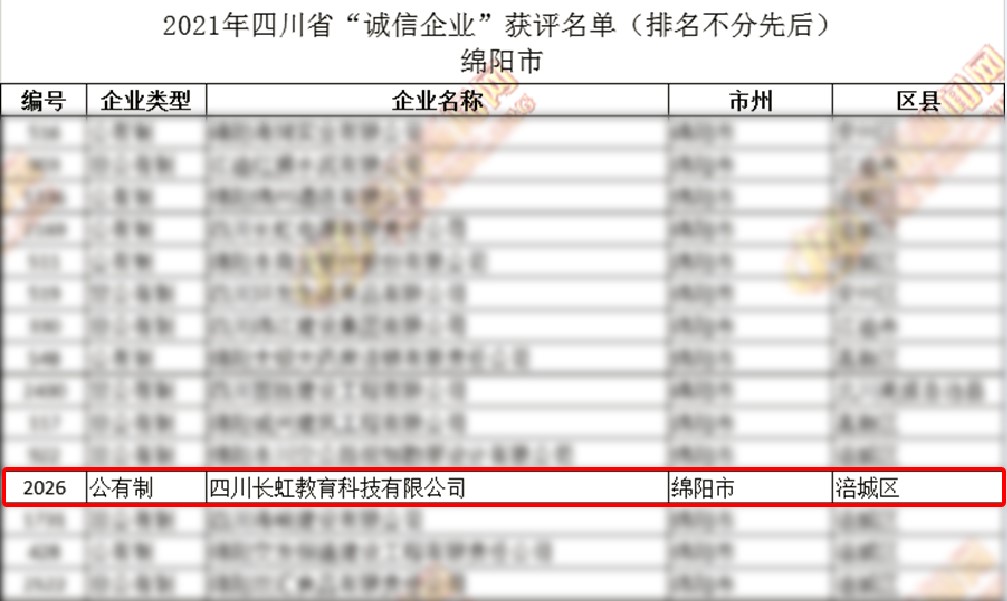 近日,由四川省發展改革委、省委網信辦、省國資委等25部門聯合開展的2021年四川省“誠信企業家”及“誠信企業”評選宣傳活動,經過初審、網絡投票和專家評審順利結束。四川長虹教育科技有限公司榮獲四川省“誠信企業”榮譽稱號。