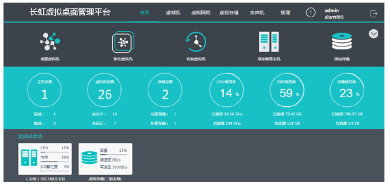 長(zhǎng)虹云智能交互系統(tǒng)還提供了交互式虛擬桌面管理平臺(tái),可實(shí)現(xiàn)智能交互大屏、筆記本電腦、臺(tái)式電腦、移動(dòng)設(shè)備接入系統(tǒng)并獲得一個(gè)專屬的空間。系統(tǒng)為每一位老師分配一個(gè)賬戶,賬戶對(duì)應(yīng)老師的個(gè)人專屬空間,為不同學(xué)科定制的個(gè)性化空間能夠更加方便老師的教學(xué),無(wú)論是在學(xué)校的任意一間教室或者辦公室,老師們都可以通過(guò)自己的賬戶訪問(wèn)個(gè)人空間隨時(shí)隨地移動(dòng)備課和辦公。該管理平臺(tái)圖形化、可視化程度高,系統(tǒng)操作相對(duì)簡(jiǎn)易,不需要過(guò)多的培訓(xùn)和學(xué)習(xí)就能上手操作。同時(shí),還可以實(shí)現(xiàn)用戶權(quán)限集中管理設(shè)置、虛擬機(jī)狀態(tài)監(jiān)控及用戶行為查看、服務(wù)器性能狀態(tài)監(jiān)測(cè)、終端狀態(tài)監(jiān)測(cè),遠(yuǎn)程控制終端、客戶端支持強(qiáng)制重啟虛擬機(jī)、虛擬機(jī)資源分配及狀態(tài)管理等。