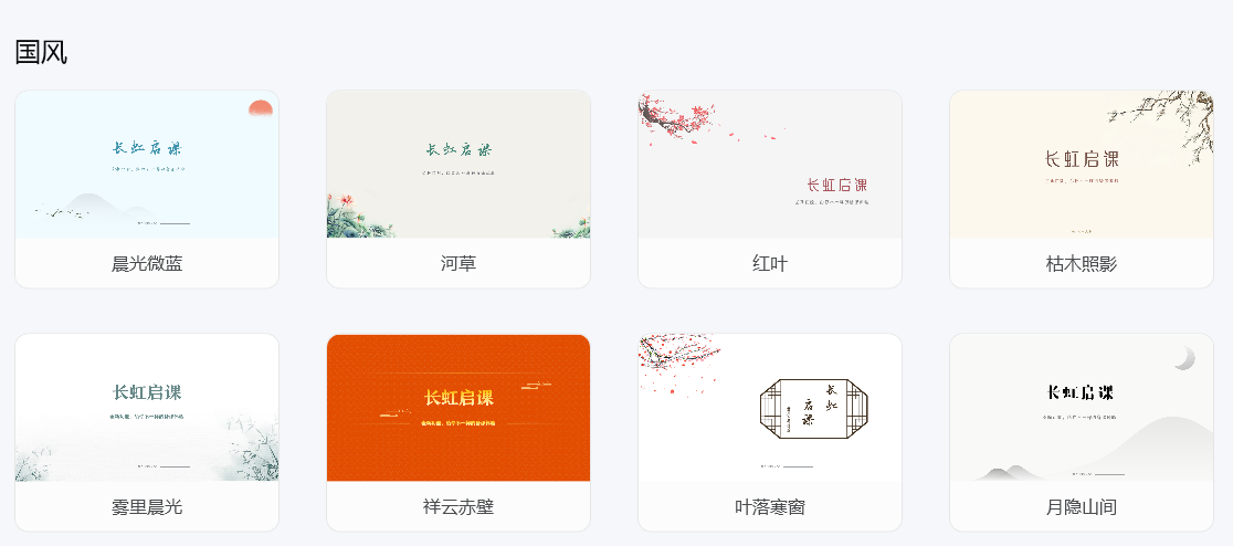 登錄長虹啟課3后,進入了云課件,可以新建課件或直接導入課件,選擇不同顏色便簽。進入新建課件,按照不同的教學環境和課程內容,提供了“國風”、“簡約”、“卡通”、“學科”四個類別多種不同課件模板。當您的任務等級達到“黃金”級還可解鎖更多的課件模板。