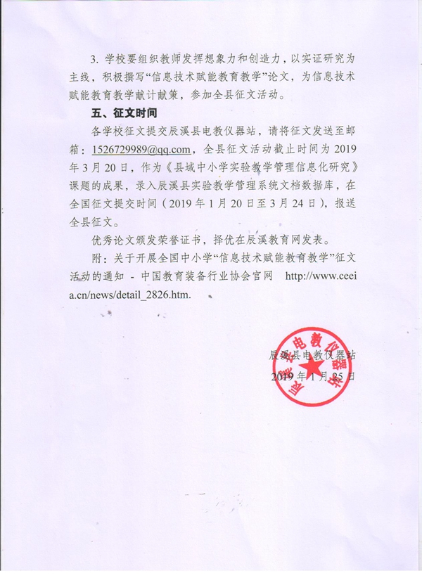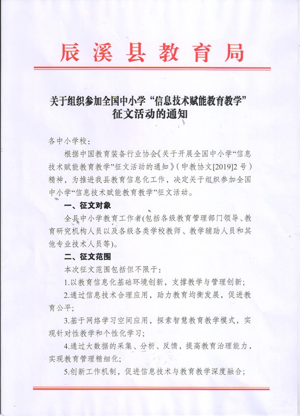 辰溪縣電教儀器站關(guān)于組織參加全國中小學“信息技術(shù)賦能教育教學”征文活動的通知