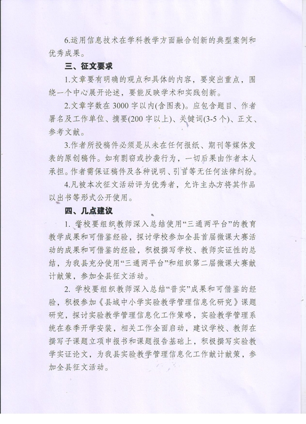 1. 學校要組織教師深入總結(jié)使用“三通兩平臺”的教育教學成果和可借鑒經(jīng)驗,探討學校參加全縣首屆微課大賽活動的成果和可借鑒的經(jīng)驗,積極撰寫學校、教師實證性的總結(jié),為我縣充分使用“三通兩平臺”和組織第二屆微課大賽獻計獻策,參加全縣征文活動。