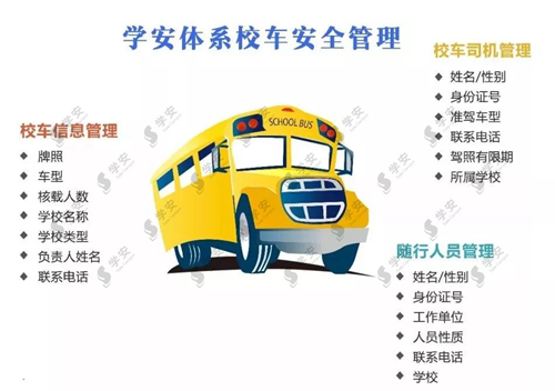 學安校車安全管理包括校車信息管理、校車司機管理和隨行人員管理,通過對校車人和物的全方位管理,將校車安全隱患消除在萌芽狀態,營造良好安全的校車運營環境。