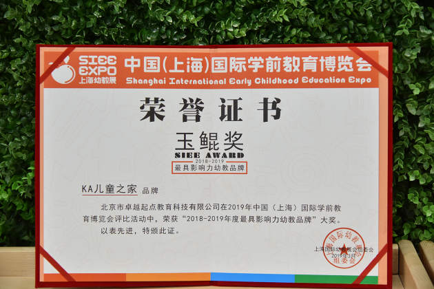 2019年3月7日,由中國(上海)國際學前教育博覽會主辦的上海國際幼教年會盛大開幕,KA兒童之家攜系統(tǒng)化整體解決方案亮相,并獲評“2019最具影響力幼教品牌”。