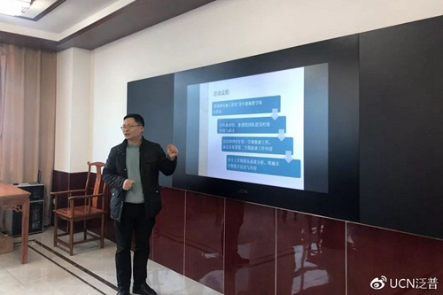 納米智能黑板中間的觸控屏上,展示著本次啟動大會老師們的研討內容。名師工作室的揭牌儀式,在黑板前進行著,工作室的領銜人蔡海峰發表講話,他認為工作室是老師共同成長的一個平臺。能夠為這個特別的平臺助力,與泛普“科技助力教育”的信念不謀而合。