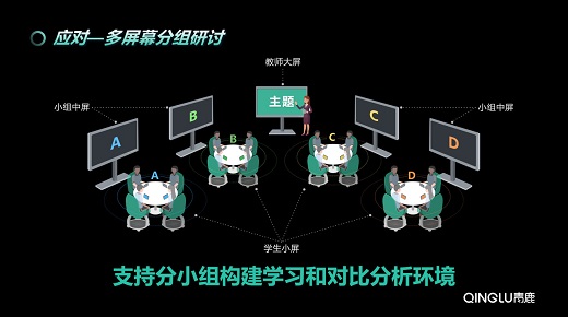 在多屏研討的教學場景下,教師通過課堂分組,實現(xiàn)課堂當中的三屏互動,讓每個小組成員自由分享學習成果,構建小組探究、自主學習的智慧學習環(huán)境。