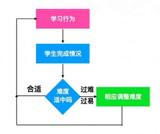 在Ⅱ級自適應學習中,不把學習行為的對錯和某一個單一課程掛鉤,而是建立一套完整的難度遞增的課程,當學生學習行為完成度較好,提供大難度的課程,當學習行為完成度不高,就提供減少難度的課程,我們也可以稱之為基于難度設計的自適應學習。