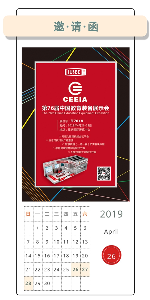 由中國教育裝備行業協會主辦,重慶市教育委員會、重慶市商務委員會承辦的第76屆中國教育裝備展示會,將于2019年4月26日至28日在重慶國際博覽中心隆重舉行。展會以“展示、交流、合作、發展”為主題,全面展示各級各類學校教育裝備的新產品、新技術、新成果。在此,佳比誠邀廣大新老客戶親臨現場參觀、體驗!