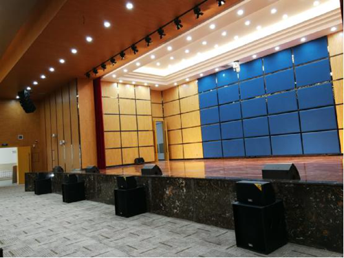 該項目報告廳,觀眾容納量超800余人,對聲場的環境設計十分重要,如廳內聲壓分布均勻度、音頻質量、系統穩定性有著高要求。現代的多功能報告廳既用于語言類擴聲使用,更兼具舞臺演出音頻擴聲用途,在擴聲系統設計時,依據場地深度、寬度、高度對擴聲設備的選配、布局安裝作了科學合理的計算分析。