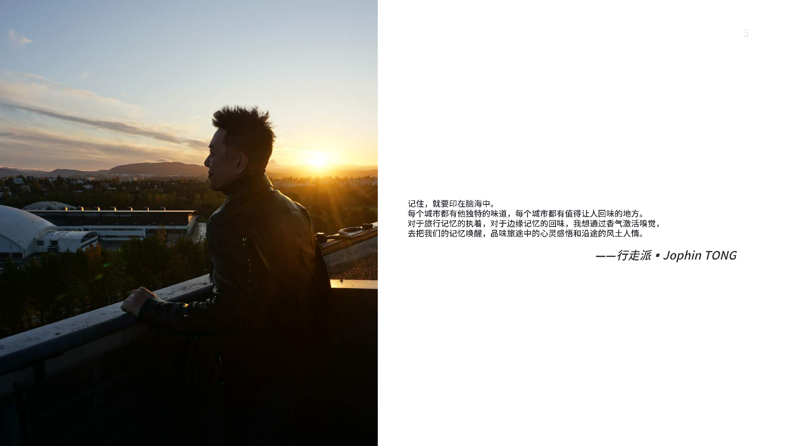 芳譜香水的靈魂起源于一場15年漫長的旅行。創(chuàng)始人Jophin Tong是狂熱的旅行愛好者,15年的時間他幾乎走遍了世界各個角落,了解了千百種自然景色與歷史文化。神奇的是,這些匯集了自然與人類文明的目的地,沒有兩個地方是完全相似的。