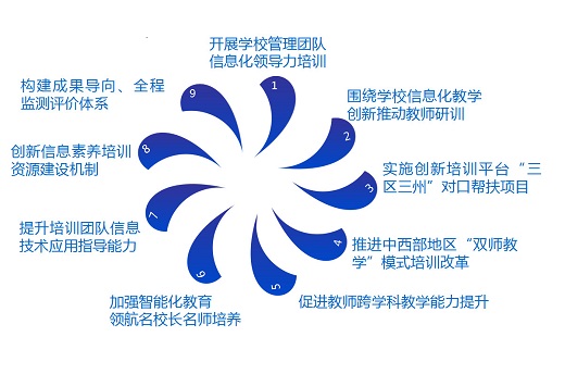 為落實四大任務,《意見》同時提出包括開展學校管理團隊信息化領導力培訓,圍繞學校信息化教學創新推動教師研訓,實施創新培訓平臺“三區三州”對口幫扶項目,推進中西部地區“雙師教學”模式培訓改革等九項主要措施。九項措施分別與四大任務對應。