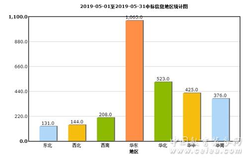 從5月中標(biāo)信息地區(qū)統(tǒng)計(jì)圖(如圖8所示)和全國(guó)中標(biāo)信息地區(qū)占比圖(如圖9所示)來(lái)看:華東地區(qū)中標(biāo)信息量為1065條,占比37%;華北地區(qū)中標(biāo)信息量為523條,占比18%;華中地區(qū)中標(biāo)信息量為425條,占比15%;華南地區(qū)中標(biāo)信息量為376條,占比13%;西南地區(qū)招中標(biāo)信息量為208條,占比7%;東北地區(qū)中標(biāo)信息量為131條,占比5%;西北地區(qū)中標(biāo)信息量為144條,占比5%。