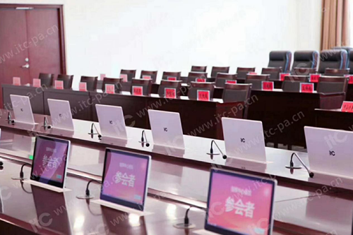 會議室的itc無紙化會議系統,采用雙屏帶升降麥的方案,話筒與屏幕一起升降,不占用桌面使用面積,會議室整體效果美觀大方。同時,為會議提供高保密性保障。