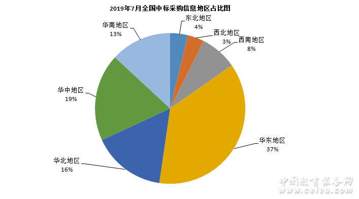 從7月中標信息地區統計圖(如圖8所示)和全國中標信息地區占比圖(如圖9所示)來看:華東地區中標信息量為1935條,占比37%;華中地區中標信息量為982條,占比19%;華北地區中標信息量為826條,占比16%;華南地區中標信息量為685條,占比13%;西南地區招中標信息量為415條,占比8%;東北地區中標信息量為199條,占比4%;西北地區中標信息量為185條,占比3%。