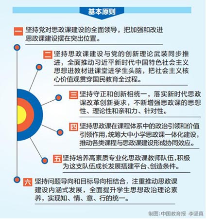 3.基本原則。一是堅持黨對思政課建設(shè)的全面領(lǐng)導(dǎo),把加強(qiáng)和改進(jìn)思政課建設(shè)擺在突出位置。二是堅持思政課建設(shè)與黨的創(chuàng)新理論武裝同步推進(jìn),全面推動習(xí)近平新時代中國特色社會主義思想進(jìn)教材進(jìn)課堂進(jìn)學(xué)生頭腦,把社會主義核心價值觀貫穿國民教育全過程。三是堅持守正和創(chuàng)新相統(tǒng)一,落實新時代思政課改革創(chuàng)新要求,不斷增強(qiáng)思政課的思想性、理論性和親和力、針對性。四是堅持思政課在課程體系中的政治引領(lǐng)和價值引領(lǐng)作用,統(tǒng)籌大中小學(xué)思政課一體化建設(shè),推動各類課程與思政課建設(shè)形成協(xié)同效應(yīng)。五是堅持培養(yǎng)高素質(zhì)專業(yè)化思政課教師隊伍,積極為這支隊伍成長發(fā)展搭建平臺、創(chuàng)造條件。六是堅持問題導(dǎo)向和目標(biāo)導(dǎo)向相結(jié)合,注重推動思政課建設(shè)內(nèi)涵式發(fā)展,全面提升學(xué)生思想政治理論素養(yǎng),實現(xiàn)知、情、意、行的統(tǒng)一。