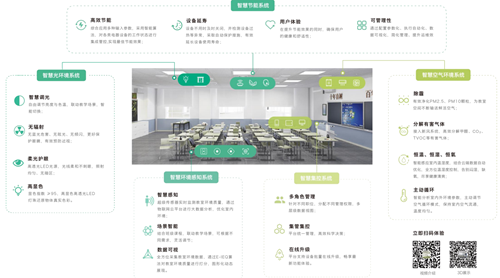 數言智慧環境教室解決方案將物聯網技術應用到教室環境中,該解決方案由五個部分組成:智慧光環境系統、智慧環境感知系統、智慧集控系統、智慧空氣環境系統、智慧節能系統。同通過對聲學環境、光環境、空氣質量(PM2.5、CO2、甲醛、TVOC、PM10等)、溫度、濕度等的實時監測和調節,一方面確保教室環境滿足國家相關標準,另一方面為廣大師生營造一個健康、節能、高效、可管理的學習環境。