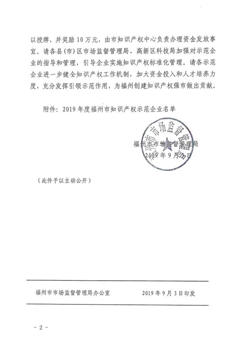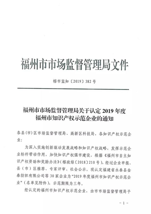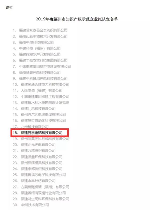 日前,由福州知識產權局組織評審的"2019年度福州知識產權優勢示范企業"結果已出爐,福建捷宇電腦科技有限公司被認定為"福州知識產權示范企業"。"福州知識產權示范企業"是福州市知識產權局對企業知識產權創造、運用、保護、管理等方面工作突出授予的榮譽,能獲此殊榮標志著公司知識產權工作獲得新的高度。