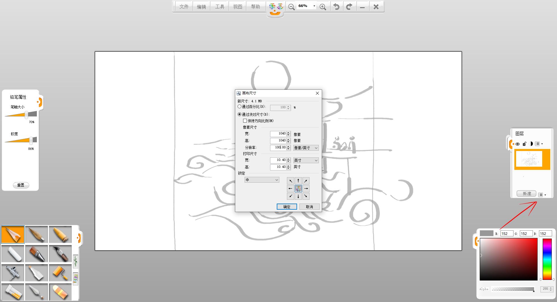 4.點(diǎn)擊箭頭所指功能模塊,選擇重新設(shè)置畫布尺寸,估算好草稿的外輪廓范圍,在彈出欄修改畫布參數(shù),設(shè)置為一塊正方形畫卷。