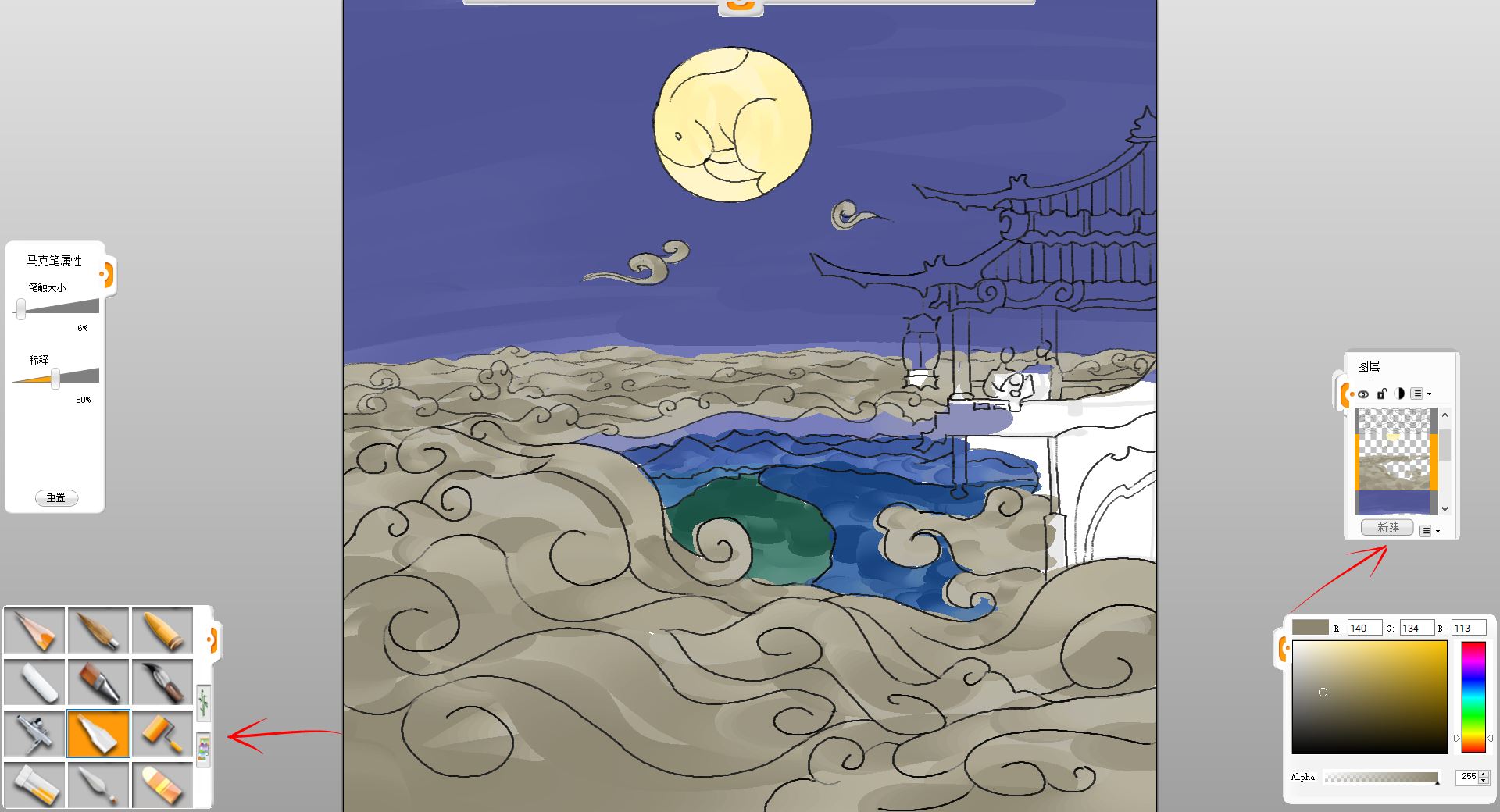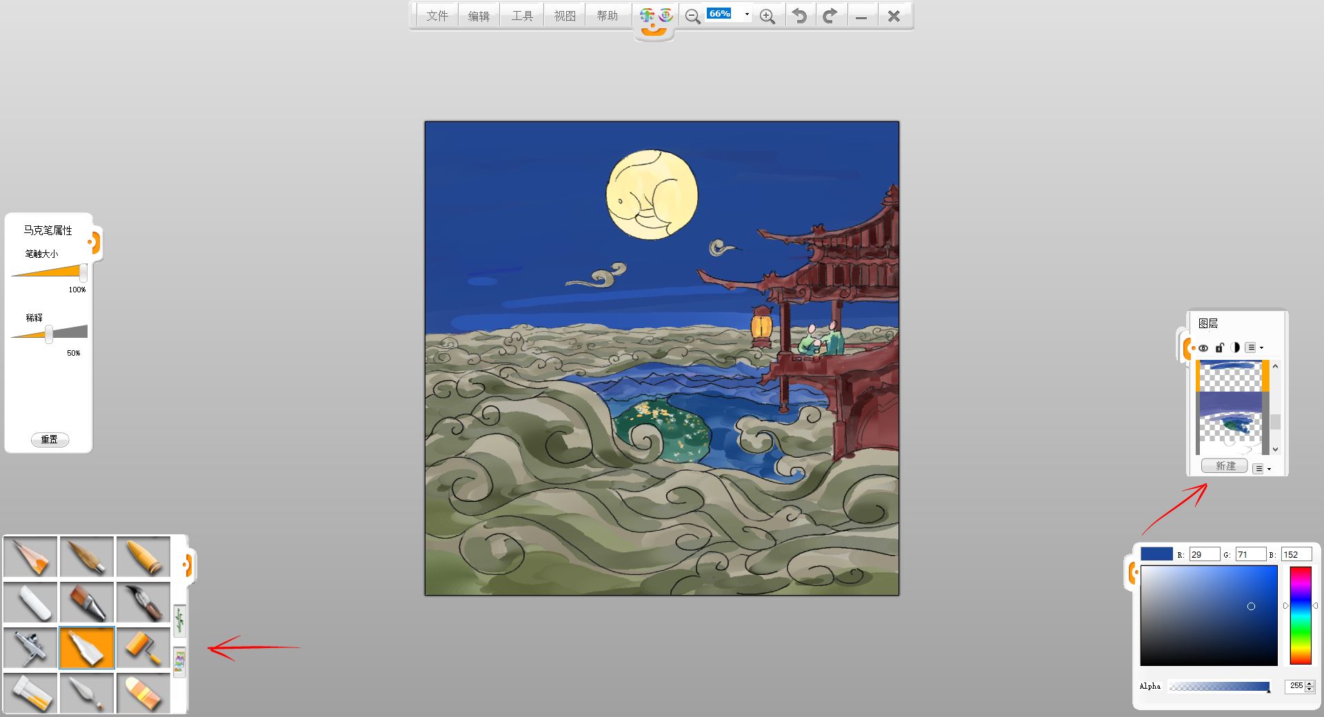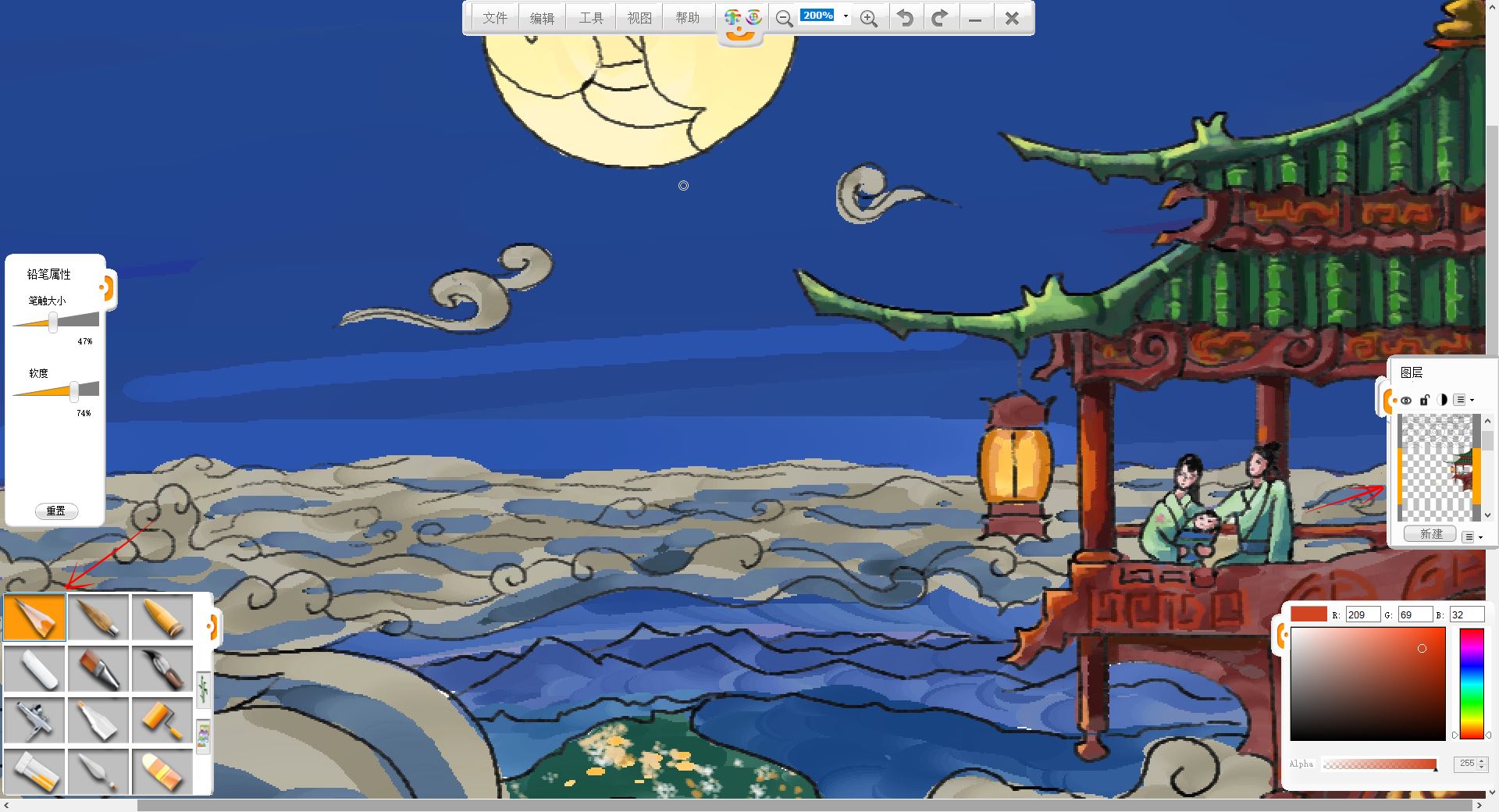10.新建一個(gè)圖層,用馬克筆筆觸給小樓和賞月的一家三口簡(jiǎn)單鋪色。
