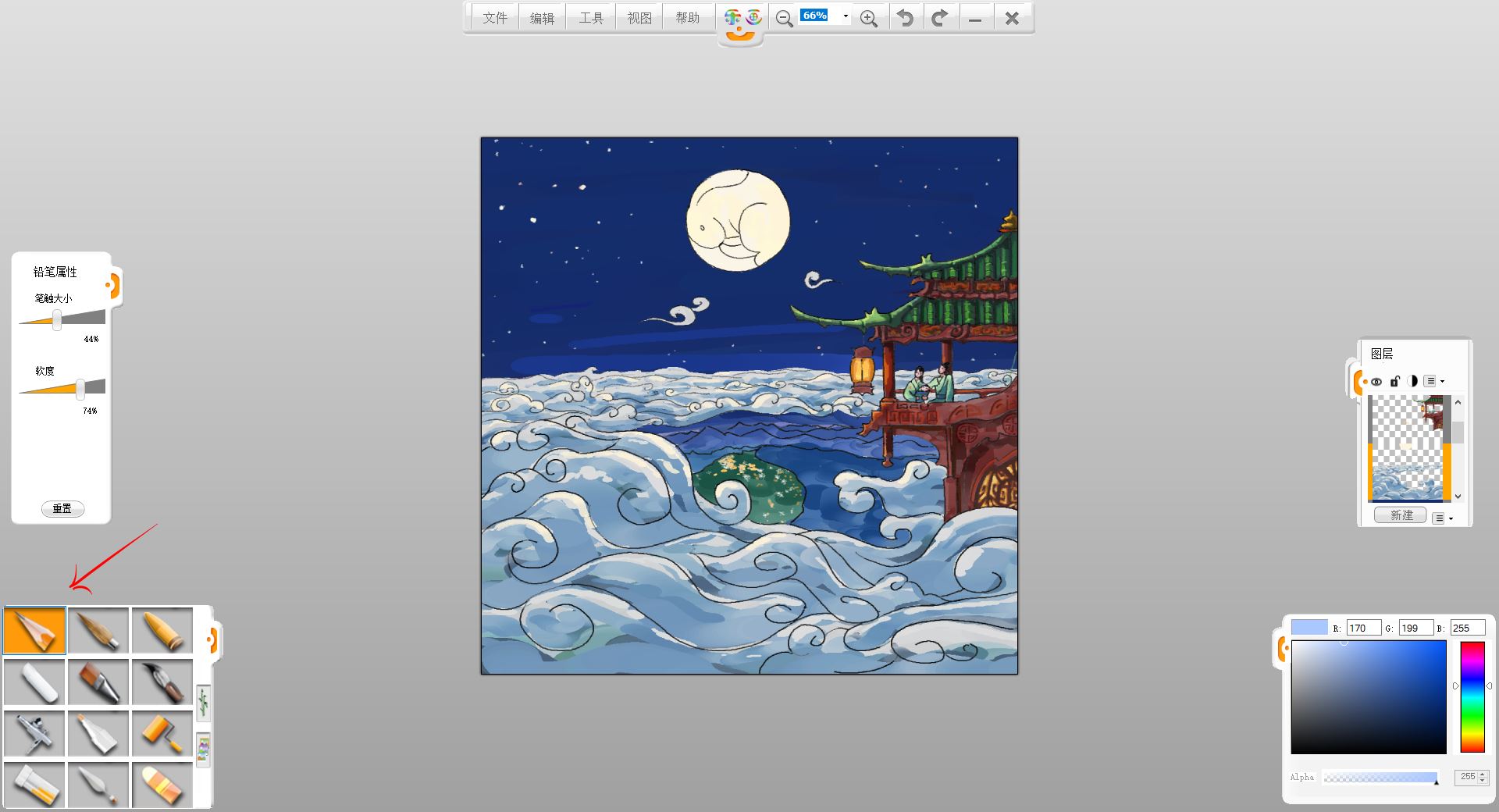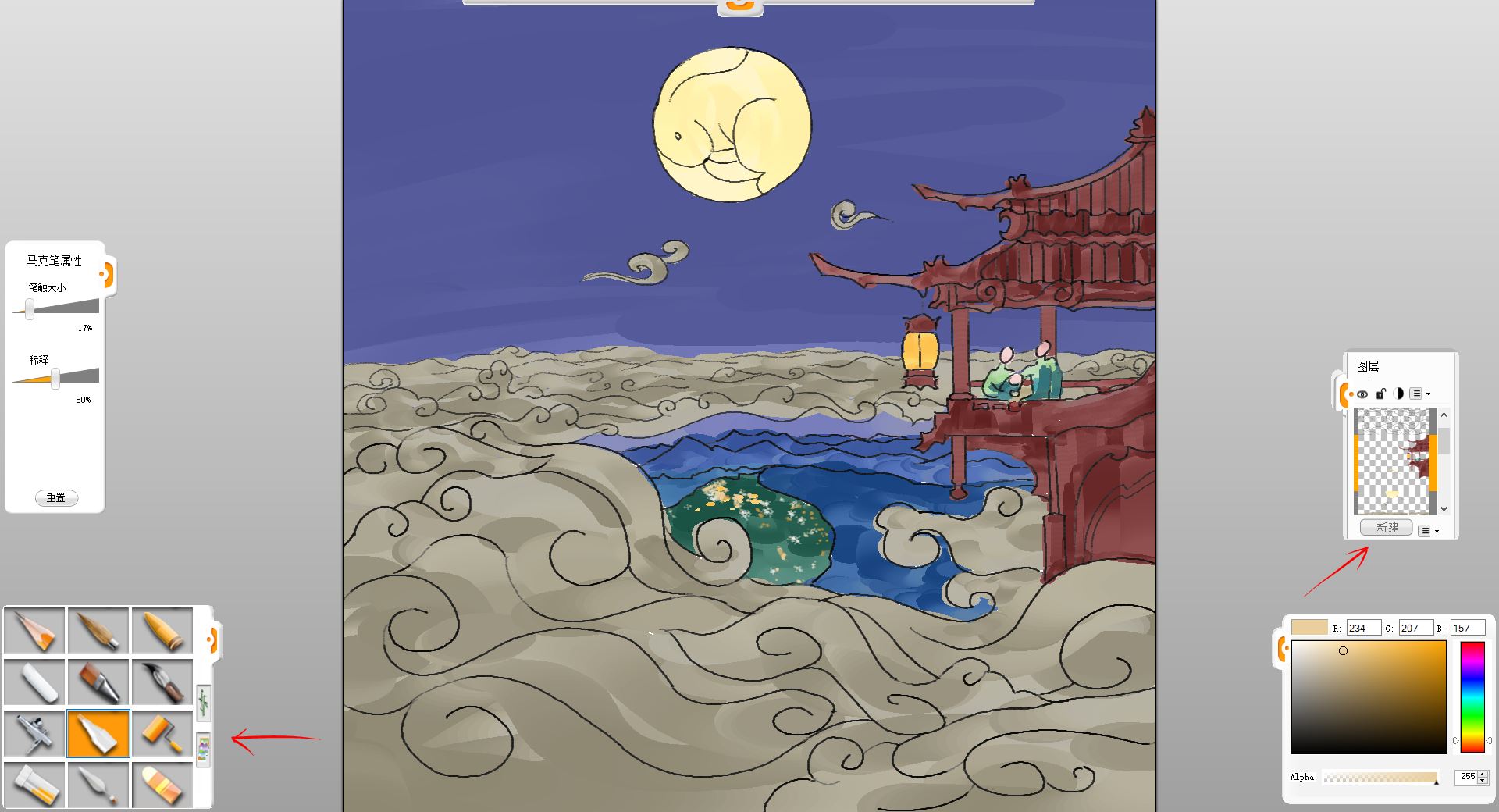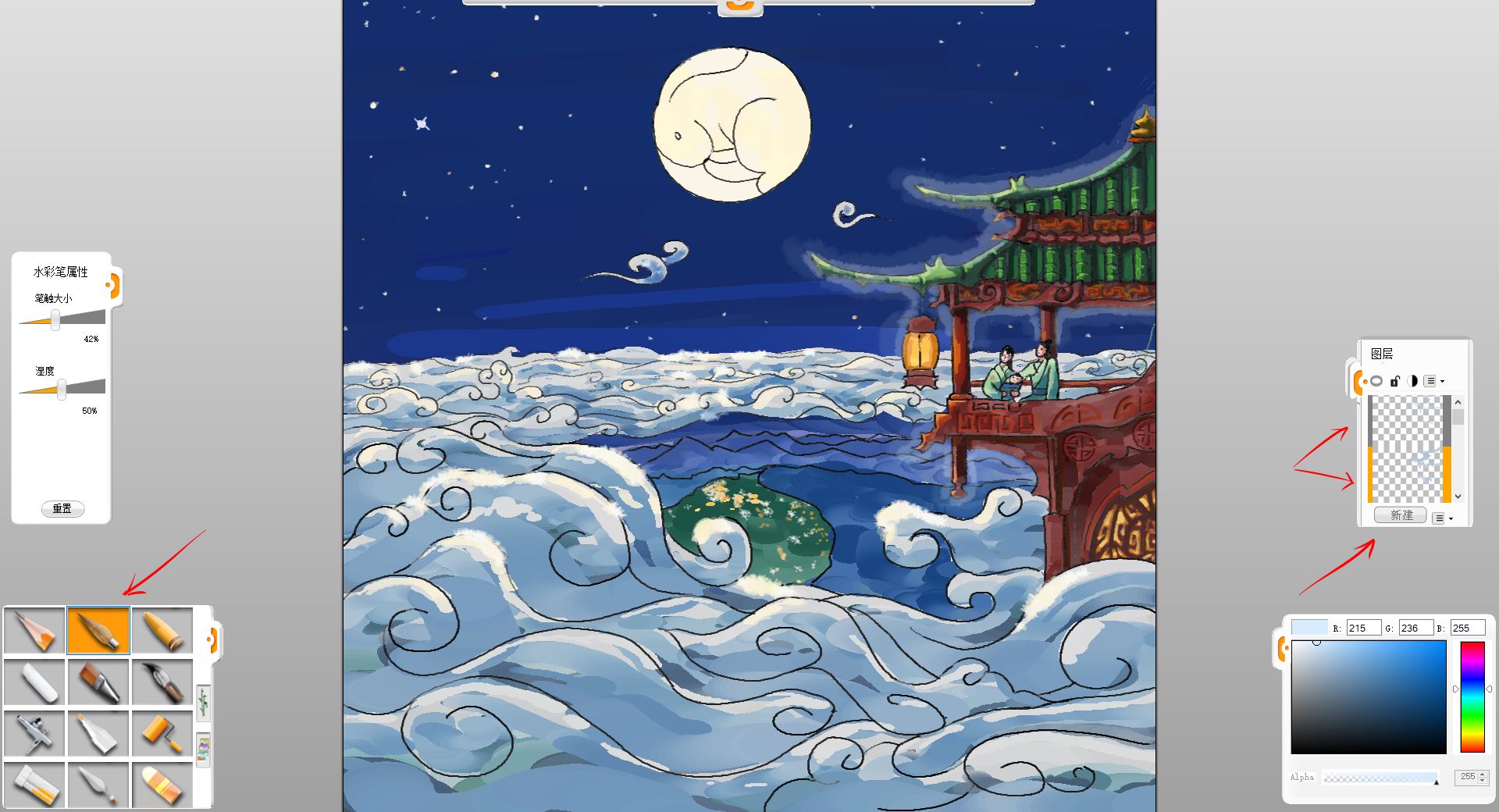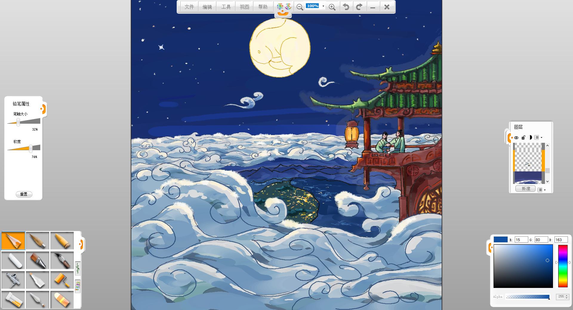 19. 最后潤(rùn)色調(diào)整些細(xì)節(jié),擦掉一些邊邊角角沒畫好的,這樣一副中秋瓊宇賞月圖就完成了。
