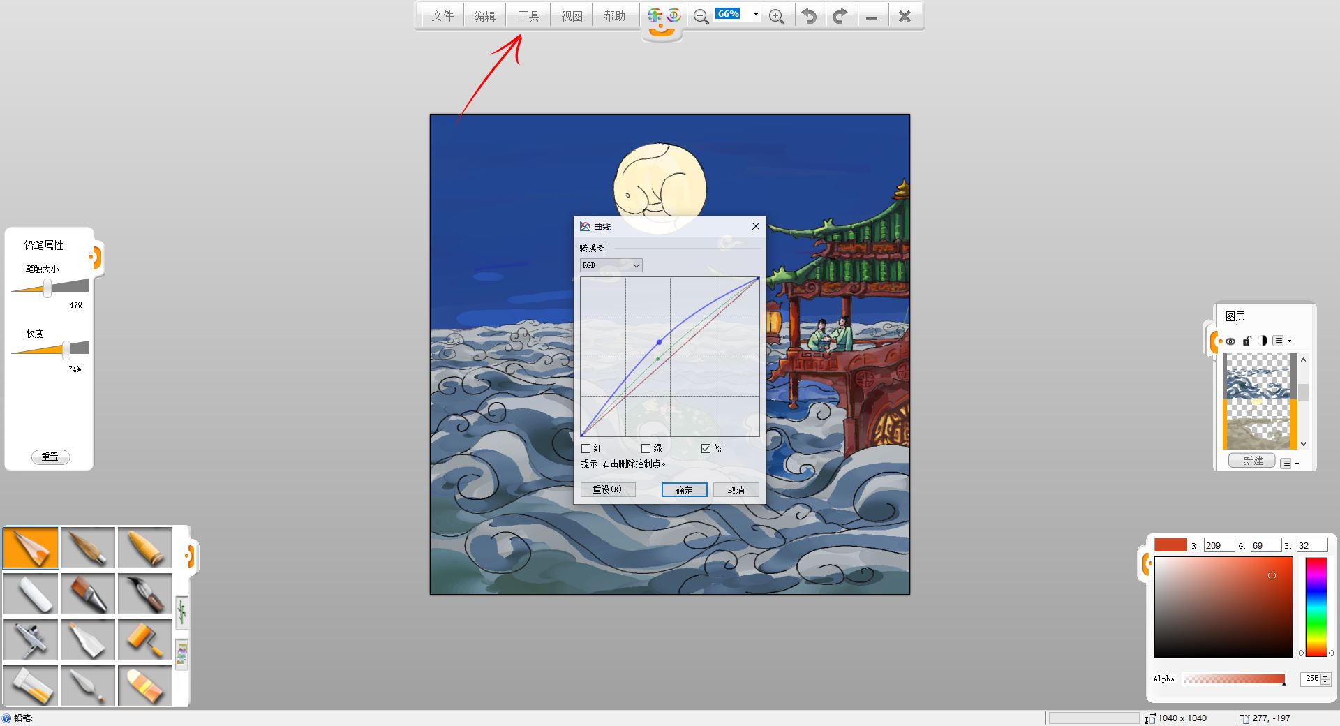 13.使用“工具”-“調(diào)整”-“曲線”調(diào)整工具,給云層調(diào)色,之前偏綠,而夜晚的云層應(yīng)該偏藍(lán)色,選中云層圖層,這里可以用曲線調(diào)整工具調(diào)整亮度和色相。