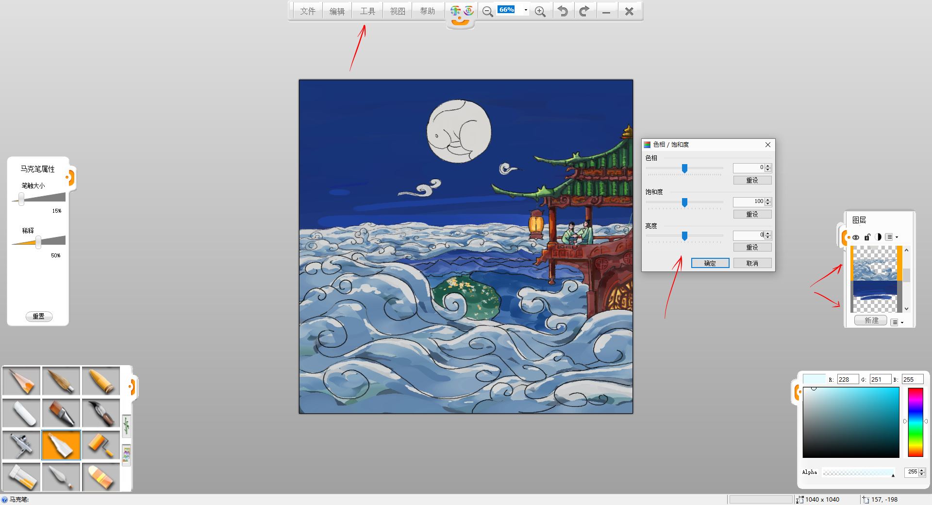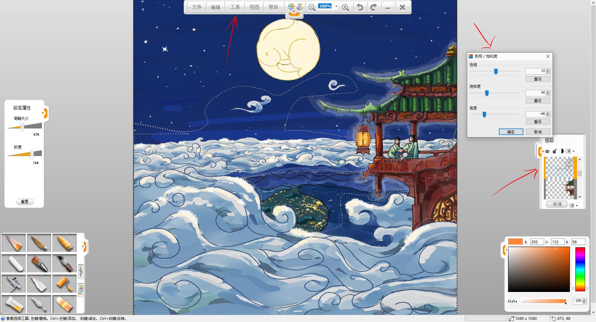 12.用“工具”-“調(diào)整”-“色相/飽和度”調(diào)整工具,調(diào)整云暗面圖層的色相,使其更符合環(huán)境色。然后合并樓宇,人物圖層,使用鉛筆工具,刻畫建筑圖案和陰影等細(xì)節(jié),對(duì)著月亮和燈籠的一面偏亮,背著的一面偏暗,線稿也可以稍作調(diào)整。
