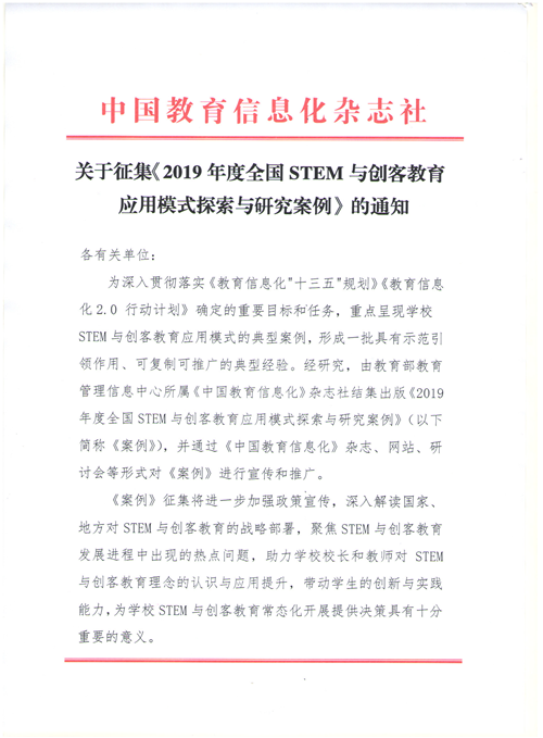 中國教育信息化雜志社關于征集《2019年度全國STEM與創客教育應用模式探索與研究案例》的通知