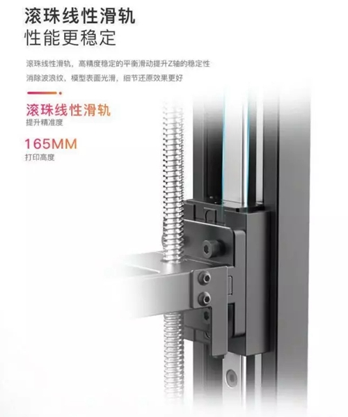 LD-002R采用滾珠線性滑軌設計,它的每一個細微移動,由此都變得精準無誤,有效保證托盤升降的穩定性及定位精度,助力打印平穩輸出,此設計還提升Z軸的穩定性,消除波浪紋,模型表面光滑,細節還原效果更好。