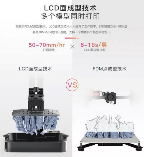 相較于FDM點成型技術,LCD面成型技術大大提升了工作效率,打印速度為6-18s/層,最高70mm/hr的打印速度,支持一個物體多個模型同時打印,可全面提升打印速度,細膩還原每個真實創意。