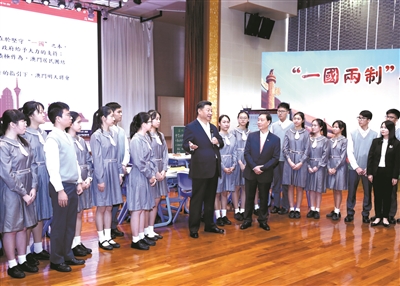 12月19日,國家主席習近平在澳門特別行政區(qū)行政長官崔世安陪同下,來到位于澳門黑沙環(huán)的政府綜合服務(wù)中心和濠江中學附屬英才學校,同澳門市民和師生親切交流。在濠江中學附屬英才學校觀摩以“‘一國兩制’與澳門”為題的中國歷史公開課后,習近平走到學生中間即席發(fā)表重要講話。新華社記者 鞠鵬 攝