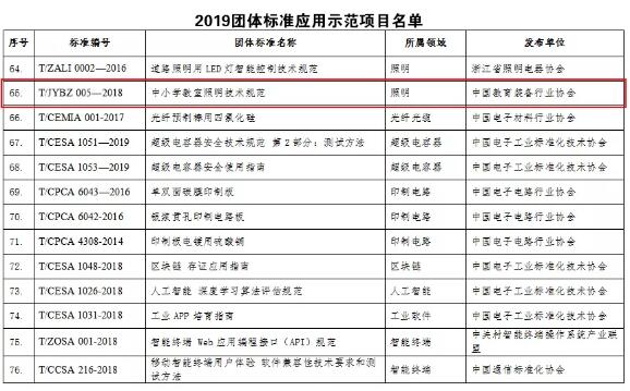 12月18日,中華人民共和國工業和信息化部發布《工業和信息化部關于公布2019年團體標準應用示范項目名單的通告》,為大力培育發展團體標準,支持團體標準的推廣應用,共遴選103項2019年團體標準應用示范項目。由中國教育裝備行業協會發布,立達信提出并牽頭制定的團體標準T/JYBZ 005-2018《中小學教室照明技術規范》入選其中。