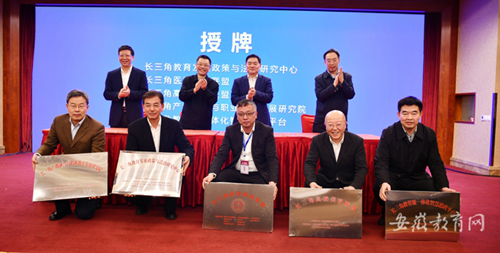 會上,一市三省教育行政部門與會負責同志為“長三角教管服一體化智慧思政平臺項目”“長三角教育發(fā)展政策與法治研究中心建設(shè)項目”“長三角醫(yī)學(xué)教育聯(lián)盟建設(shè)項目”“長三角校園足球平臺建設(shè)實踐及美育聯(lián)盟建設(shè)構(gòu)想”“長三角產(chǎn)教融合與職業(yè)教育發(fā)展研究院建設(shè)項目”授牌。