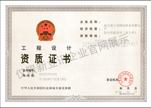 近日,新立訊科技股份有限公司獲得由江蘇省住房和城鄉(xiāng)建設廳頒發(fā)的“建筑智能化系統(tǒng)設計專項乙級”資質證書,證書編號:A232050455。