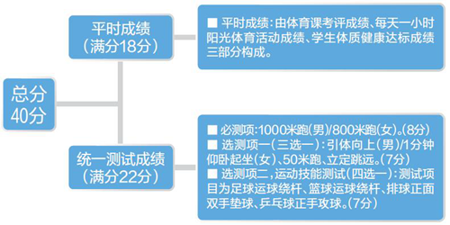 根據《天津市初中學業水平考試體育與健康科目實施方案》,“新中考體育考試”成績總分為40分,由平時成績(滿分18分)和體育統一測試成績(滿分22分)構成。平時成績由體育課考評成績、每天一小時陽光體育活動成績、學生體質健康達標成績三部分構成。統一測試內容分為必測一項和選測二項,共計三項。統一測試的必測項為1000米跑(男)/800米跑(女),分值8分。選測項一為引體向上(男)/1分鐘仰臥起坐(女)、50米跑、立定跳遠三項選一,分值為7分。選測項二為運動技能測試,測試項目為足球運球繞桿、籃球運球繞桿、排球正面雙手墊球、乒乓球正手攻球四項選一,分值為7分。統一測試自2022年上半年開始進行。