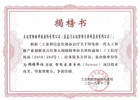 2020年1月13日,國家工業(yè)和信息化部《工業(yè)和信息化辦公廳關(guān)于印發(fā)新一代人工智能產(chǎn)業(yè)創(chuàng)新重點任務(wù)入圍揭榜單位名單的通知》,立達(dá)信成功入圍國家工信部新一代人工智能產(chǎn)業(yè)創(chuàng)新重點任務(wù)揭榜單位。