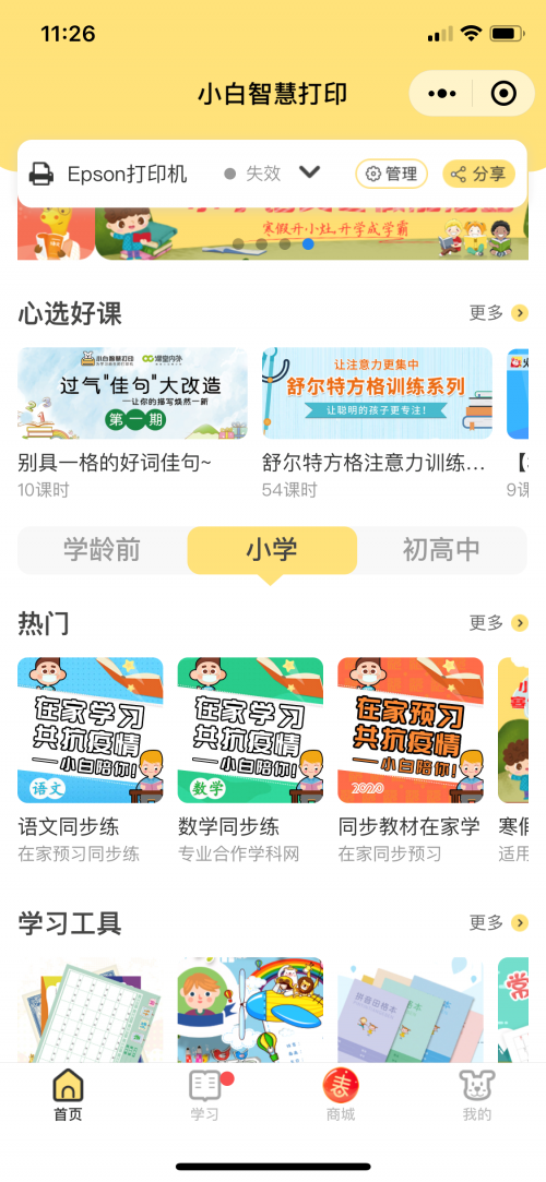 學(xué)校延期開(kāi)學(xué),就意味著開(kāi)學(xué)后學(xué)習(xí)進(jìn)度將被壓縮,這也將會(huì)讓孩子的課業(yè)壓力成倍增加。而在補(bǔ)習(xí)班也同樣不開(kāi)課的情況下,讓孩子跟上進(jìn)度不被同學(xué)落下,成為這段時(shí)間家長(zhǎng)共同的想法。愛(ài)普生微信小程序—“小白智慧打印”想家長(zhǎng)之所想,即日起學(xué)生可通過(guò)小白智慧打印, 打印相應(yīng)年級(jí)的學(xué)習(xí)資料。百分百還原課堂學(xué)習(xí)標(biāo)準(zhǔn),消除家長(zhǎng)焦慮,讓學(xué)生在家也能高效學(xué)習(xí)。
