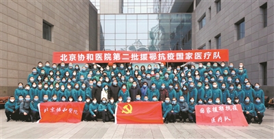 2月7日,北京協(xié)和醫(yī)院第二批援鄂抗疫國家醫(yī)療隊142名隊員在外科樓前合影。