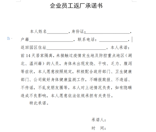 對重點疫區返工人員,企業要求員工自行隔離十四天以上才準許上班,每位員工還需簽署承諾書。