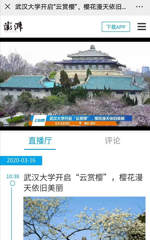 柏勝君帶你一一解鎖開啟在線“云賞櫻”。武漢大學與在各大媒體平臺上開啟直播,為大家揭秘鮮為人知武大賞櫻的最佳路線,還會邀請抗疫一線的醫護人員一起邊看邊聊。