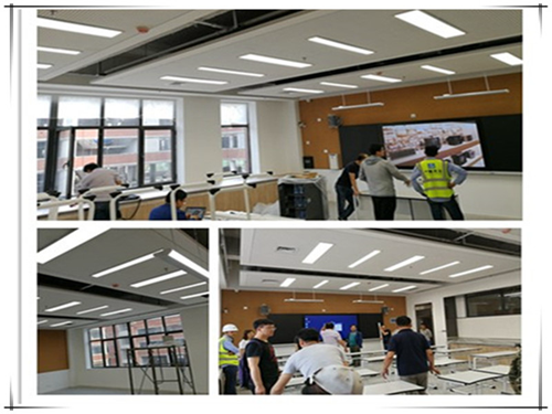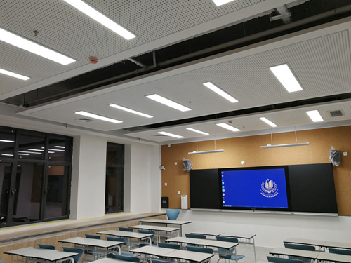 整個項目用燈2273套,吊裝994套,嵌裝1279套,不同場景分別采用不同尺寸規格型號的燈具,共十余款,在最短時間內完成安裝、調試、檢測。安裝后檢測數據:教室照明功率密度6w/m2,教室維持平均照度408lx,黑板維持平均照度766lx,教室照度均勻度0.75,黑板照度均勻度0.8,色溫5260k,顯色指數95,眩光≤16,光生物安全無危害類,全部符合及超出國家標準。