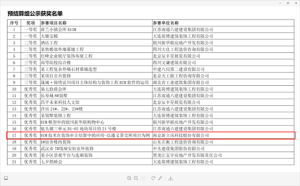 近期,新立訊參報的《BIM技術在某建筑群前期商務中的應用》和《BIM技術在裝飾審計結算中的應用》兩個項目均獲得由中國建筑裝飾協會主辦的《首屆中國建筑裝飾BIM大賽》優秀獎。