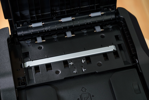 位于一體機頂部的是自動進稿器,它能自動把紙張送入打印機內部,以進行掃描或是復印,一次最多可容納20頁紙張。學生一份習題往往不會超過10頁,20頁一次復印量足以滿足日常使用了。如果用戶需要掃描或復印的是身份證、戶口本等不能彎曲的證件,可以掀起一體機頂蓋,用平板掃描器直接掃描。