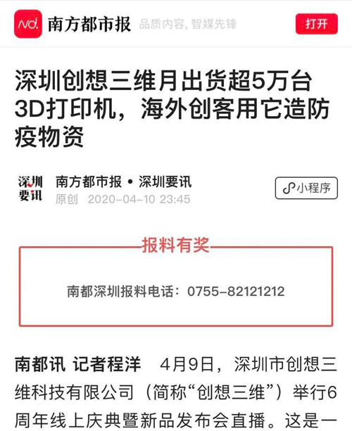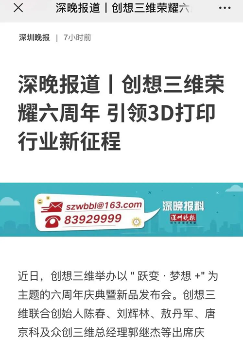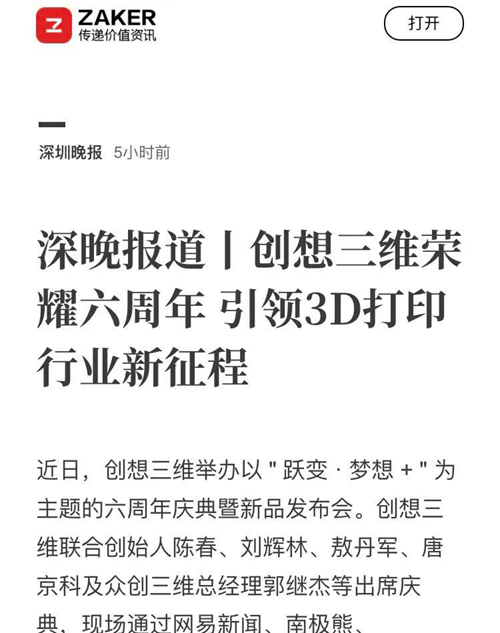 最后,感謝各大媒體平臺對創想三維的關注和認可。創想三維牢記使命,六年來風雨兼程。在3D打印高科技行業,創想三維始終把研發和創新當成立身之本,樹立行業標桿,號召同行一起努力,共同推進3D打印產業的進步與發展。面對社會責任,創想三維第一時間發揮專業優勢投身抗“疫”,彰顯企業責任與擔當,向全社會展示了中國高科技企業的力量與信心。 以下為創想6周年慶暨新品發布會,直播回放及相關報道,如有錯過,可及時回看。