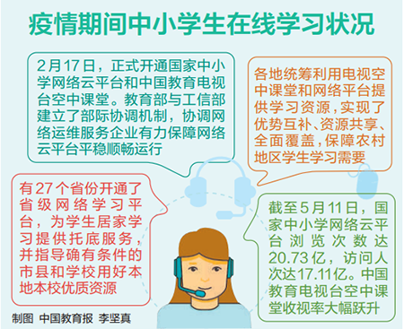 “截至5月11日,國家中小學網絡云平臺瀏覽次數達20.73億,訪問人次達17.11億。中國教育電視臺空中課堂收視率大幅躍升,在全國衛視關注度排名進入前十�!痹诮逃�5月14日舉行的新聞發布會上,教育部基礎教育司司長呂玉剛介紹疫情期間中小學在線教育有關情況時說。