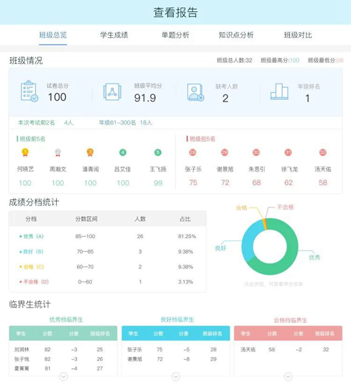 不管是在線檢測還是課后作業(yè),學生都可以在移動端人人通空間完成,無需打印,系統(tǒng)還會將作業(yè)完成情況及得分情況生成報告反饋給老師。既節(jié)省了老師批改作業(yè)的時間,又能讓老師對學情有更全面的了解。