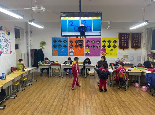 在大成小學(xué)教室,四年級(jí)一個(gè)班的學(xué)生正在上英語(yǔ)興趣課。教室正中的大屏幕上,活力十足的英語(yǔ)老師一口標(biāo)準(zhǔn)流利的英語(yǔ)。線下,幾十個(gè)孩子齊聲跟讀。英語(yǔ)老師把一個(gè)單詞拆分并輔之以豐富的肢體語(yǔ)言,并配以動(dòng)畫畫面,孩子們學(xué)得十分專注。