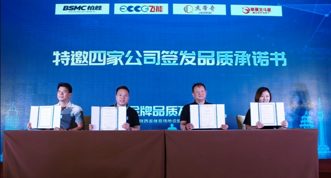 隨后,在全場200多位嘉賓的注視下,四家主辦單位公司領導人一同上臺簽署《品質承諾書》,以實際行動宣布:竭力捍衛品牌品質、品牌榮譽,堅守質量的底線決不動搖!向陜西體育設施建設行業保證保質,等于立下軍令狀,決心為陜西省體育場地設施基礎建設貢獻一份力量。
