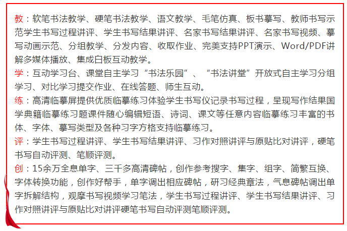 *創云版:硬件上增加了互動學生書法儀、智慧學生臨摹臺等。老師和學生可以進行雙向互動,教師端不但可以發作業給學生練習,而且還可以通過學生書法儀查看學生的書寫視頻,書法老師還可以把學生的作業、作品進行點評;學生端可以在線提交作業,也可以自主選擇學習的內容字帖、碑帖進行臨摹;軟件系統包括全息書法、全息碑帖、軟件硬筆測評等,豐富的教學資源獨特的形成了“教學練評創”五大體系,大大提升了書法課堂的互動性、趣味性,經典呈現了傳統書法與現代信息技術的完美融合,開創中國智慧書法教室的典范!