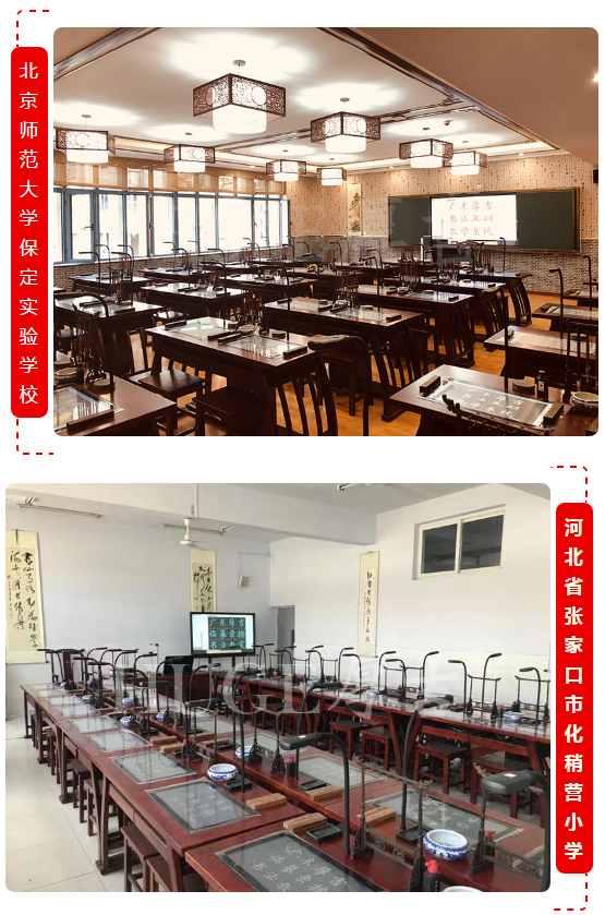 *慧云版:教師端配備了教學一體機、教師書法教學儀、專用教師中控條案,每個學生都配備了書法臨摹拷貝臺、實木桌椅等,配合厚吉書法教學系統,包括授課、備課、全息書法、碑帖資源庫等軟件資源,形成軟硬件一體化的慧云版書法教室。
