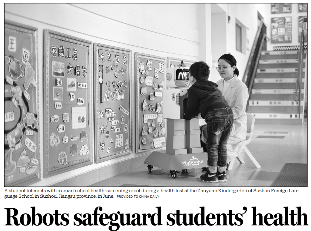 蘇州沃柯雷克晨檢機器人正在被全球媒體聚焦。7月13日,《中國日報》以《Robots safeguard students' health》為題,主版頭條刊發了對沃柯雷克晨檢機器人助力復學的報道。這也是繼3月23日中國日報國際版刊發對沃柯雷克晨檢機器人助力中國校園防疫復學的報道后,官方媒體再度“點名”沃柯雷克晨檢機器人。
